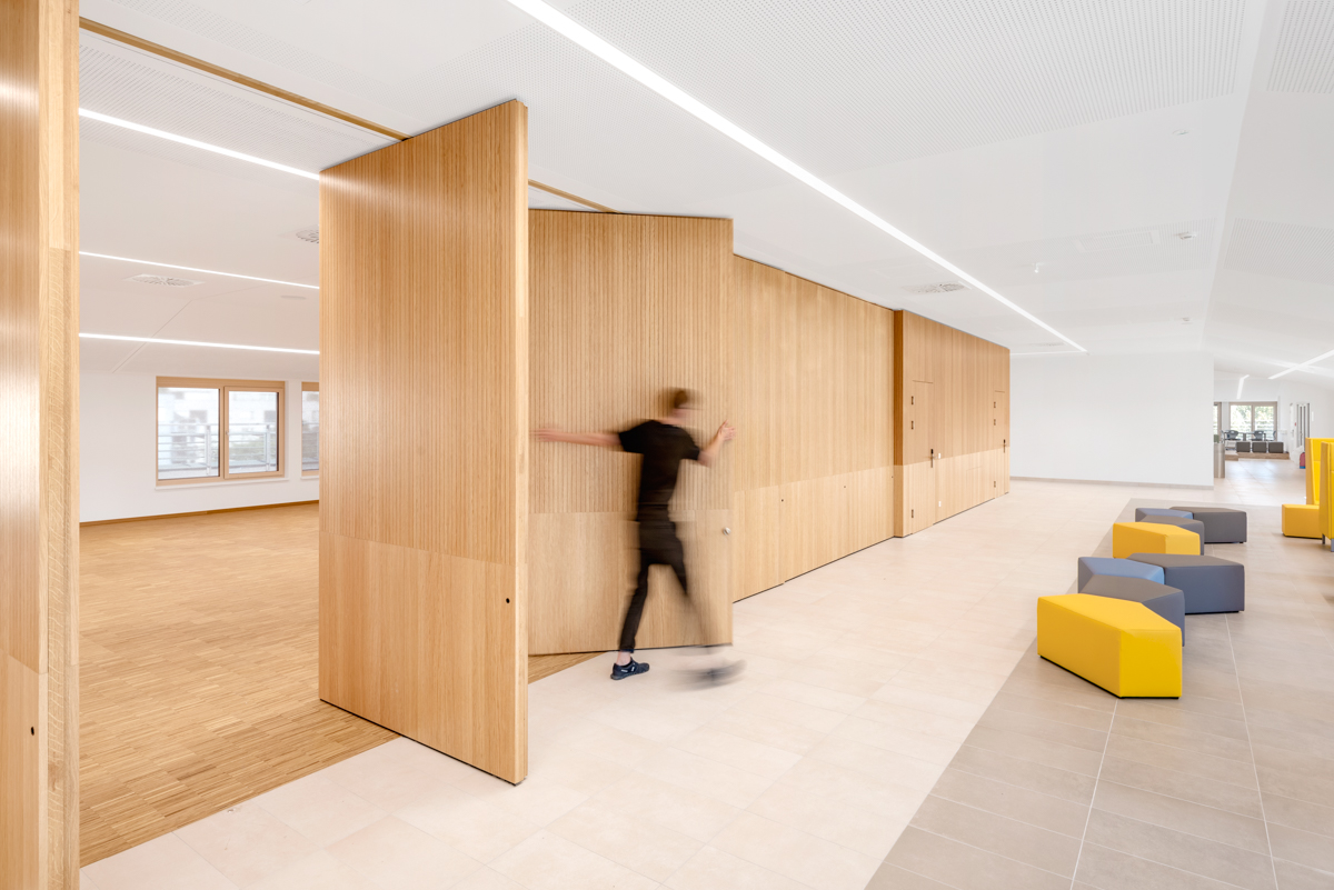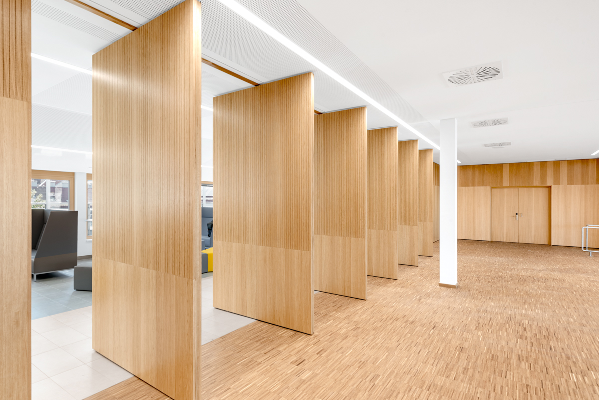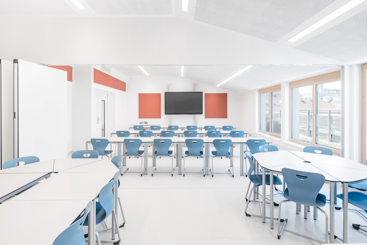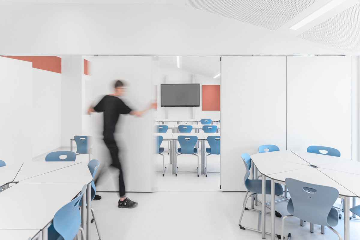 Der Klassentrakt ist klar vom Veranstaltungsbereich abgetrennt, wodurch eine deutliche räumliche Gliederung und eine einfache Orientierung erzielt werden. Für den natürlichen Lichteinfall in den Hauptgängen sorgen Freibereiche beziehungsweise Verglasungen, die eine hohe Aufenthaltsqualität ermöglichen.