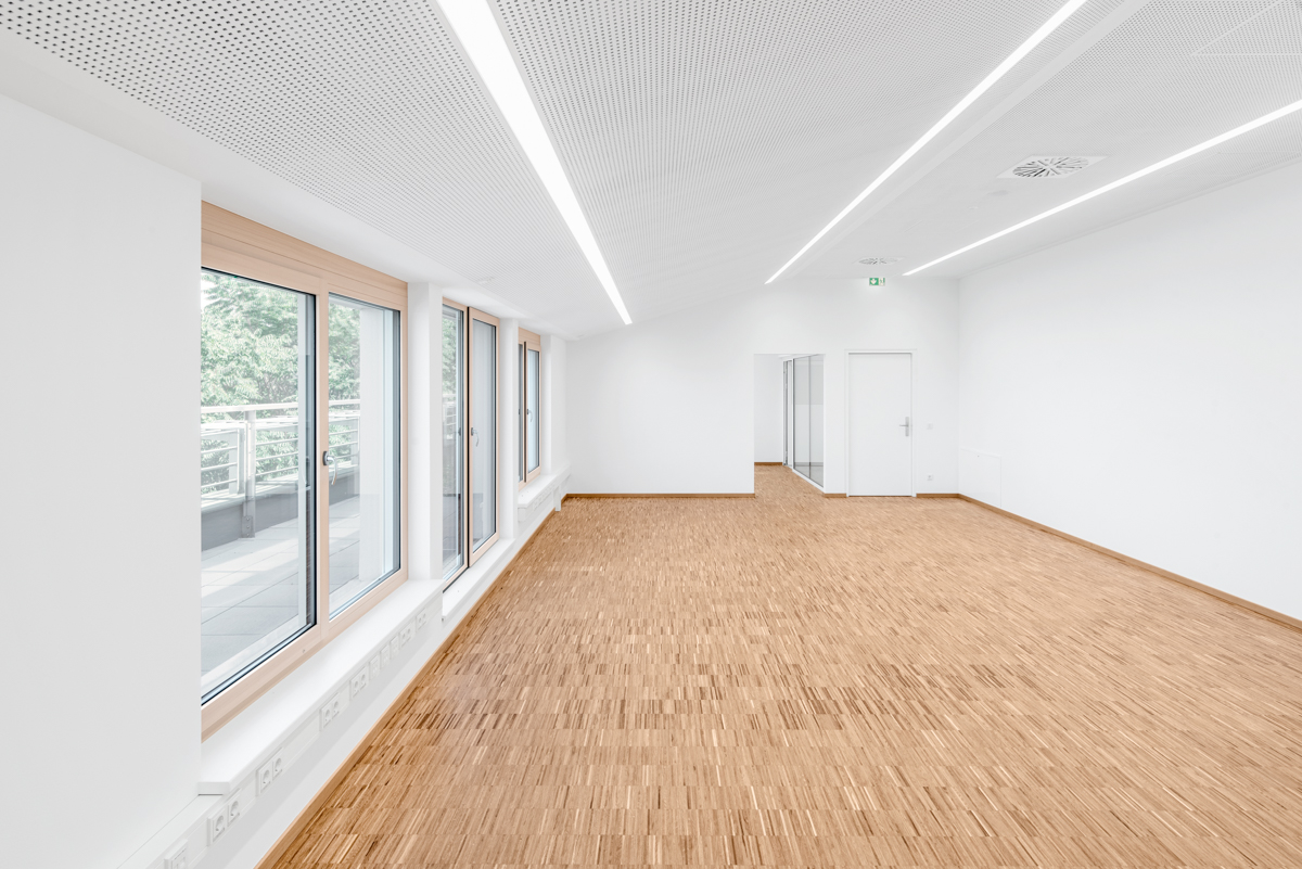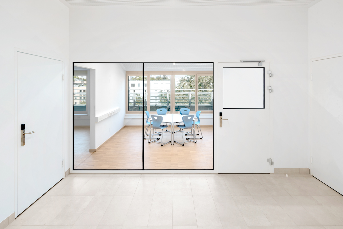 Der neue Veranstaltungs- und Konferenzbereich ist unmittelbar am Hauptstiegenhaus mit Aufzugsanbindung situiert und damit attraktiv an die bestehenden Geschosse angebunden. Ein großzügiges Foyer dient als Empfangsbereich – durch öffenbare Paneele kann dieser Vorbereich räumlich und visuell mit dem Veranstaltungsraum verbunden werden. Dadurch entsteht ein flexibel nutzbarer Raumverbund mit hoher Aufenthaltsqualität. Im laufenden Betrieb dient der Vorraum als Lern- und Pausenfläche und erzeugt so eine sinnvolle Synergie.