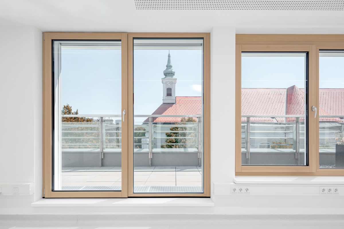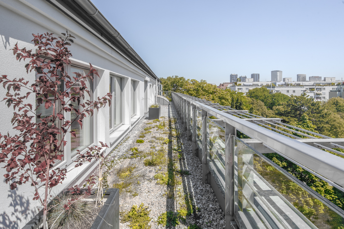 Ergänzend zum Innenausbau wurde die umlaufende Dachterrasse saniert und als qualitativ hochwertiger Aufenthaltsbereich gestaltet. Vor dem Foyer wurde eine Pergola als Sonnenschutz errichtet, während der bestehende Terrassenbelag erneuert und teilweise als extensive Begrünung ausgeführt wurde. So entsteht ein attraktiver Freiraum, der sowohl für Pausen als auch für schulische oder soziale Aktivitäten genutzt werden kann.