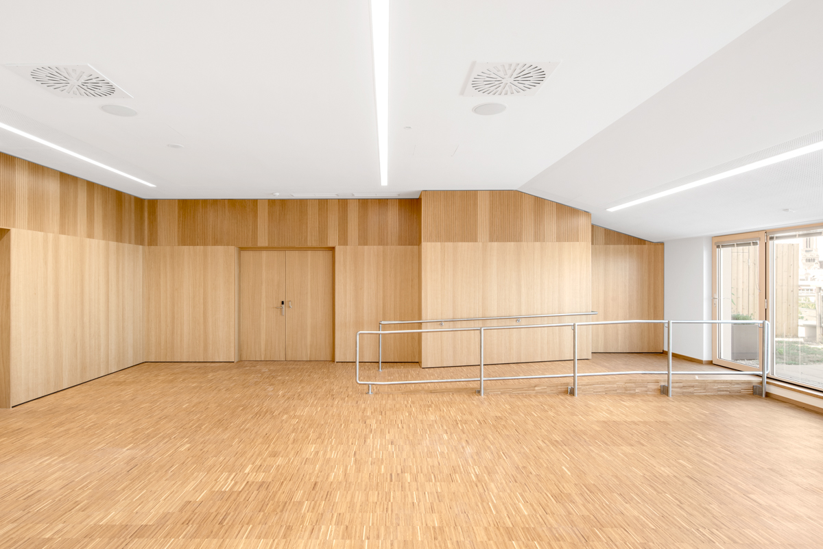 Angrenzend an den Veranstaltungsraum sind ein großzügiger Lager- sowie ein Technik- und Regiebereich angeordnet. Eine Teeküche, die sowohl vom Lehrertrakt als auch vom Veranstaltungsbereich zugänglich ist, ergänzt das Raumprogramm.