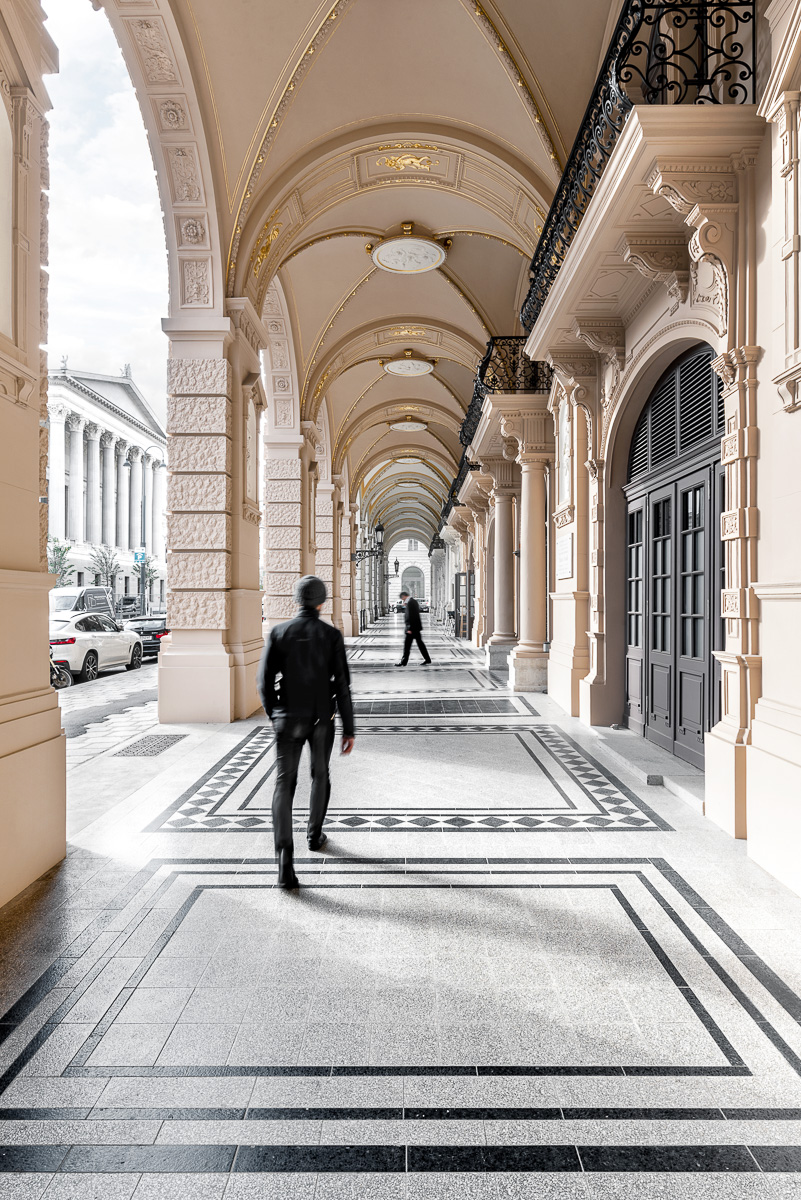 Das Erdgeschoß wurde zur Gänze umgestaltet, neue Empfangsbereiche mit Sicherheitsüberprüfung sowie ein Veranstaltungsbereich mit Cateringvorbereitung und die entsprechenden Nebenräume finden hier nun Platz. Die Räumlichkeiten in den Obergeschoßen wurden zur Büronutzung generalsaniert und mit dem Fokus auf hochwertige Oberflächen und einem wohlüberlegten Beleuchtungskonzept ausgestattet.