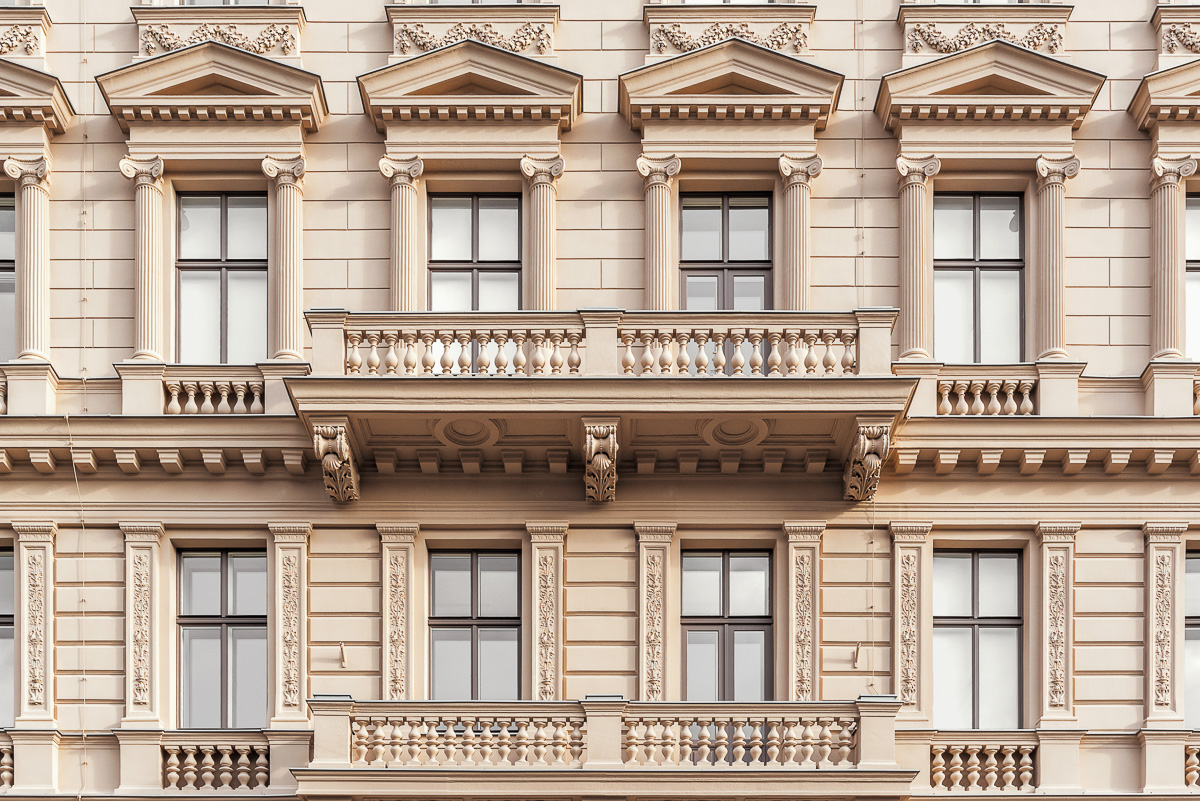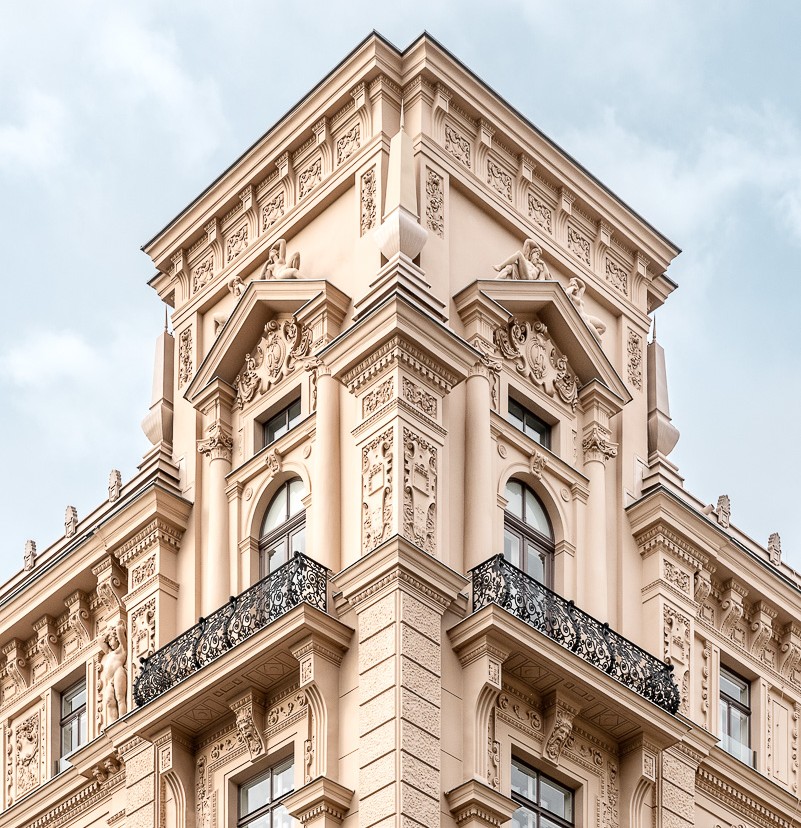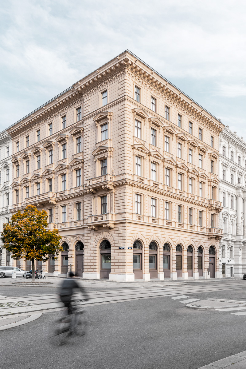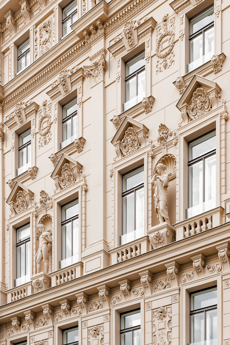Die Fassaden wurden mit besonderer Sorgfalt restauratorisch behandelt und mittels Innendämmung thermisch saniert, um nichts an ihrem Gliederungsreichtum einzubüßen.