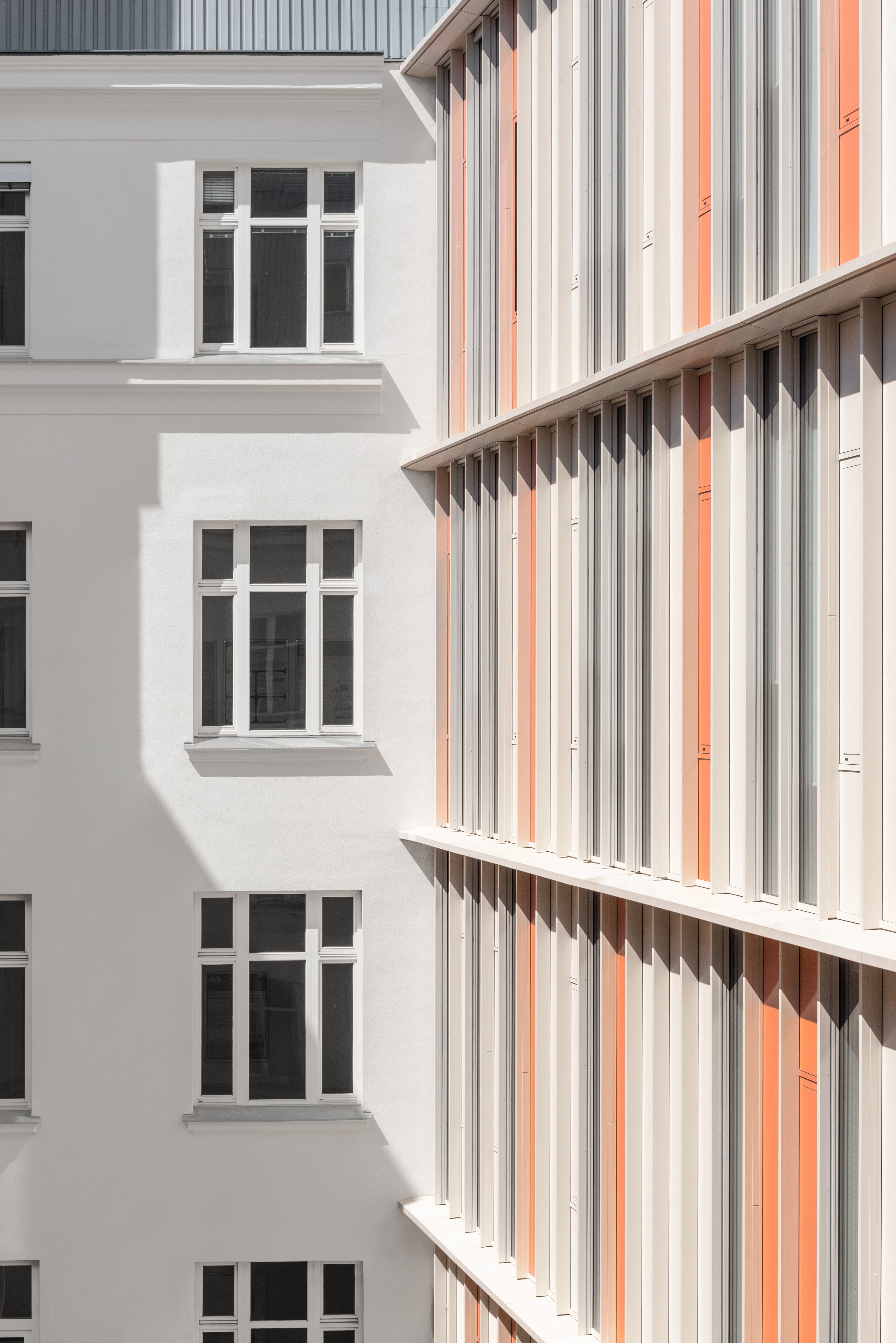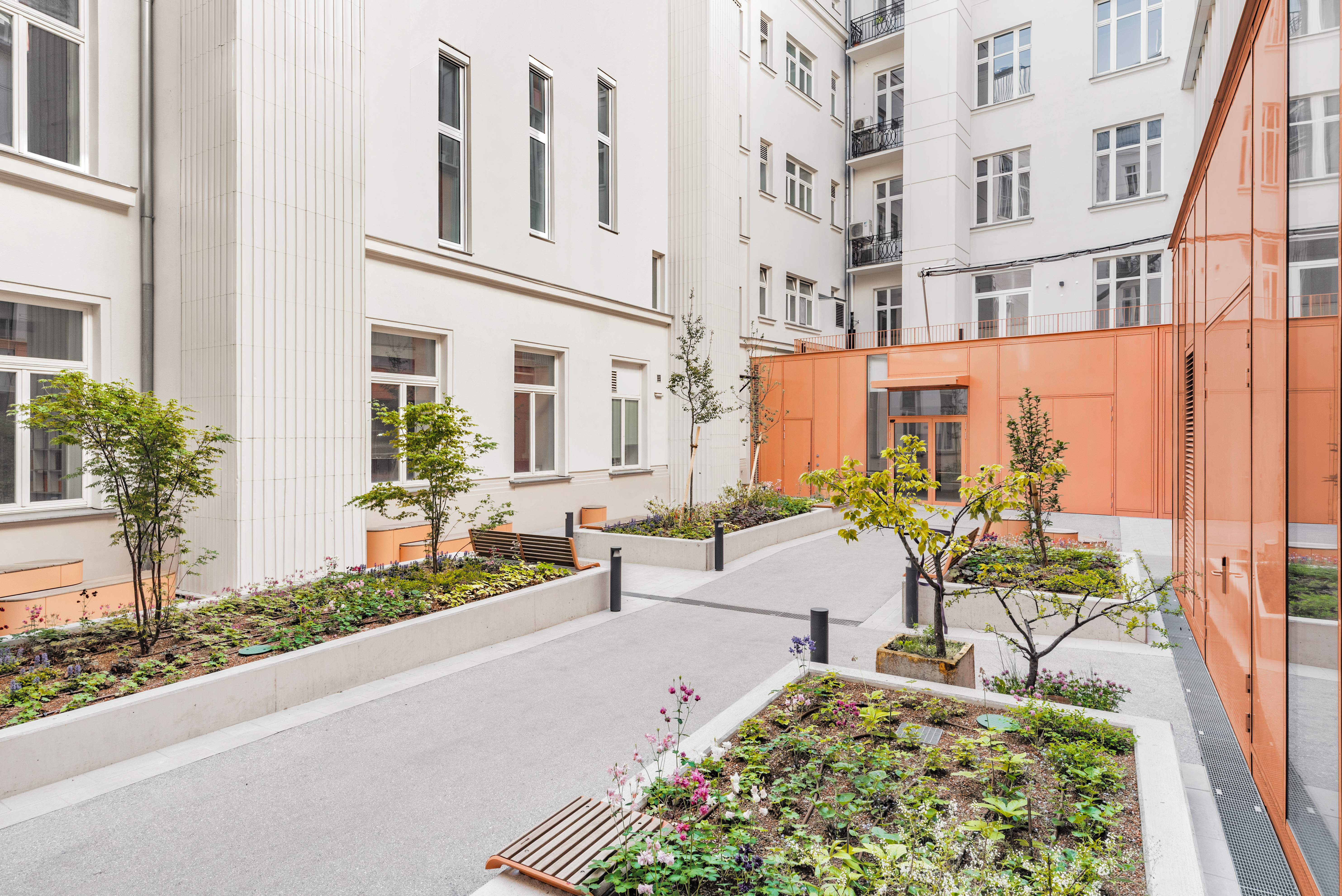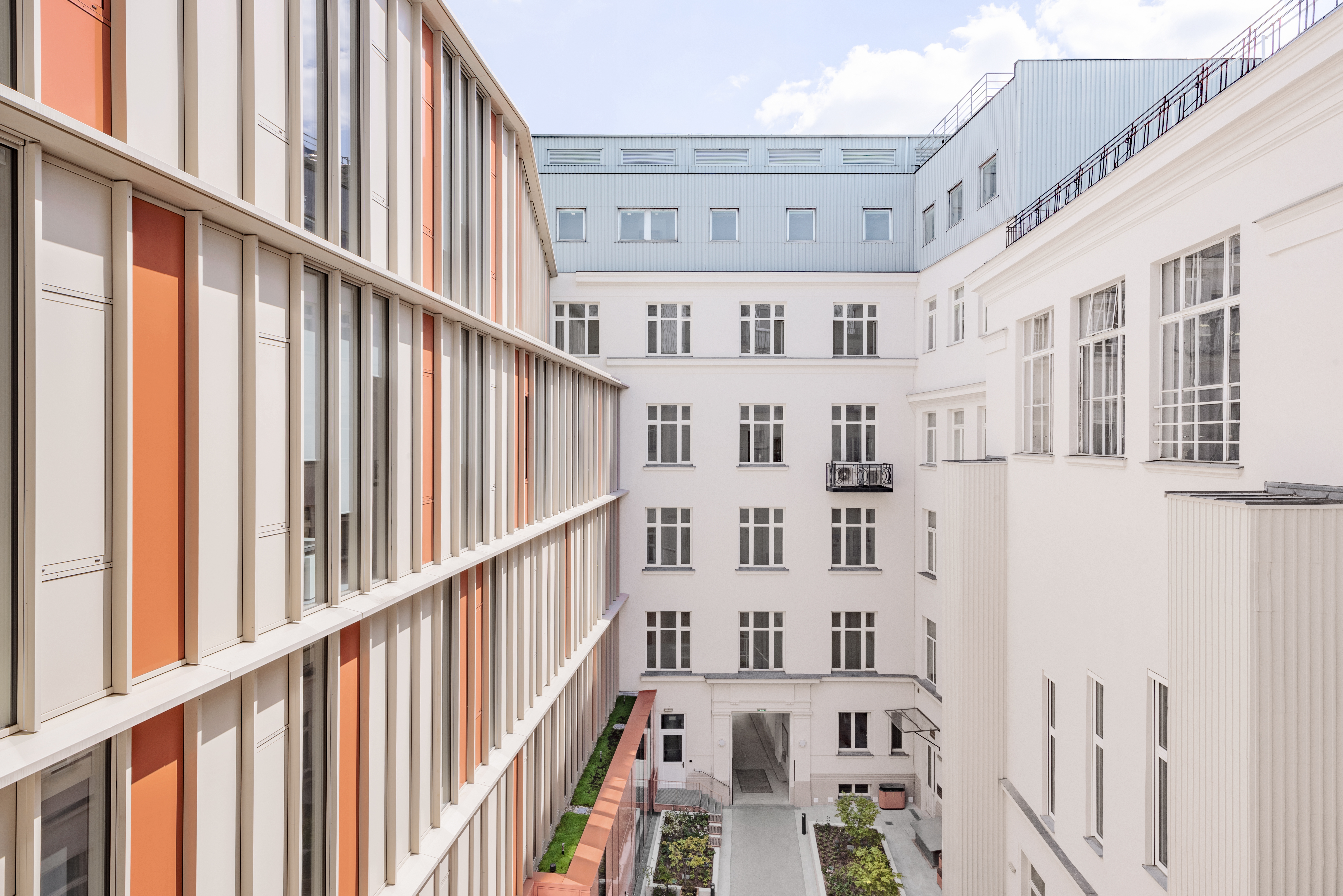 Das Außenraumkonzept sieht darüber hinaus ein Wechselspiel von Begrünung und Pflasterung im bestehenden Innenhof vor, sodass dieser deutlich an Aufenthaltsqualität gewinnt und durch eine verbesserte Zugänglichkeit die Anlieferung der Werkstätten erleichtert. Die Fassade zeigt ein rhythmisches Wechselspiel aus Glaselementen und geschlossenen, öffenbaren Paneelen in hellem Rostrot, die sich durch ihre Farbgebung harmonisch in den historischen Bestand eingliedern.