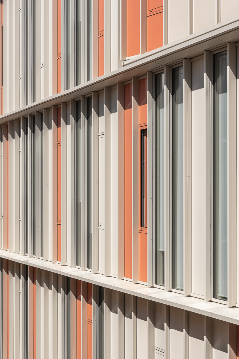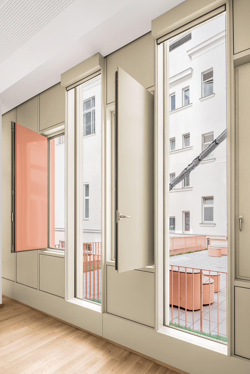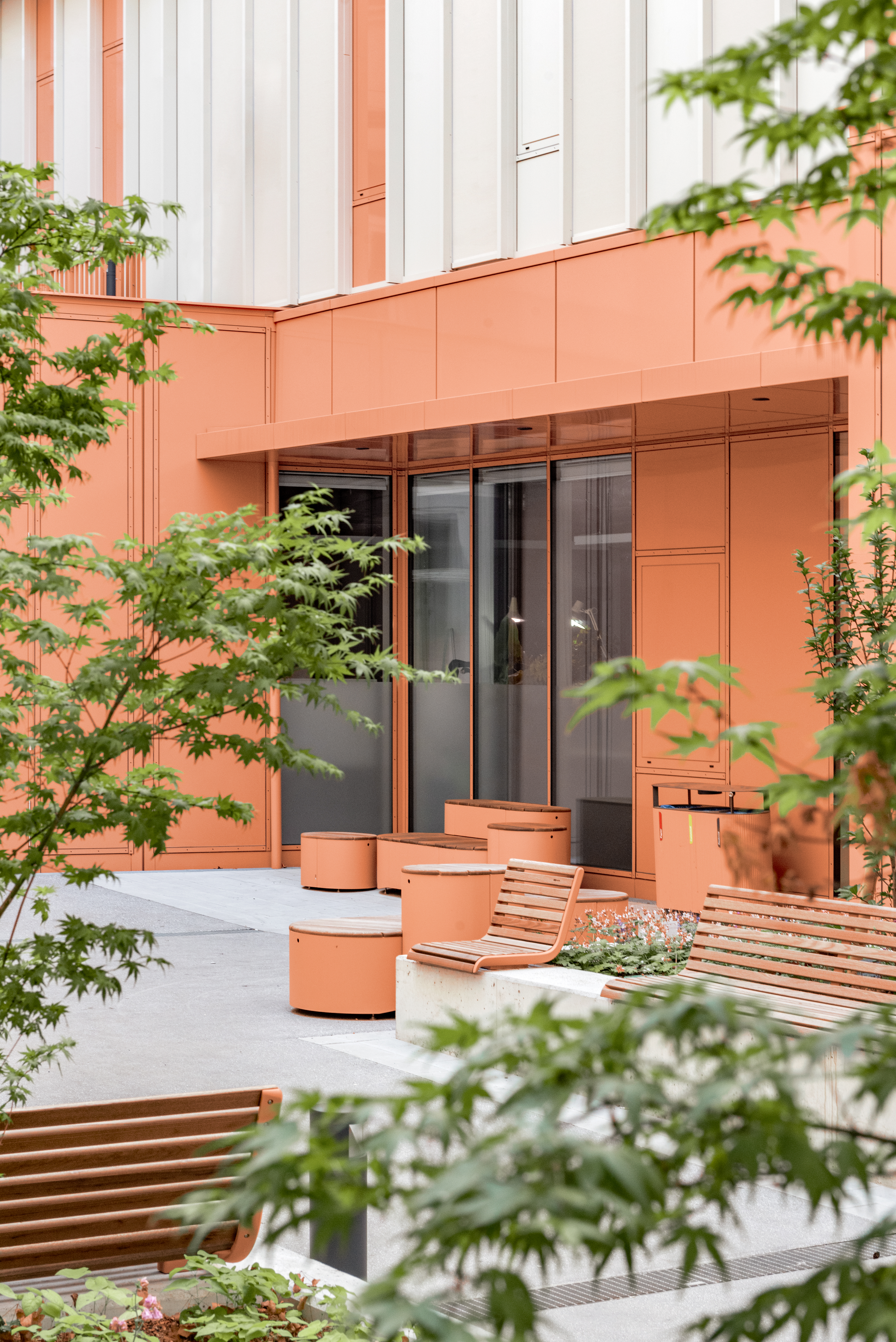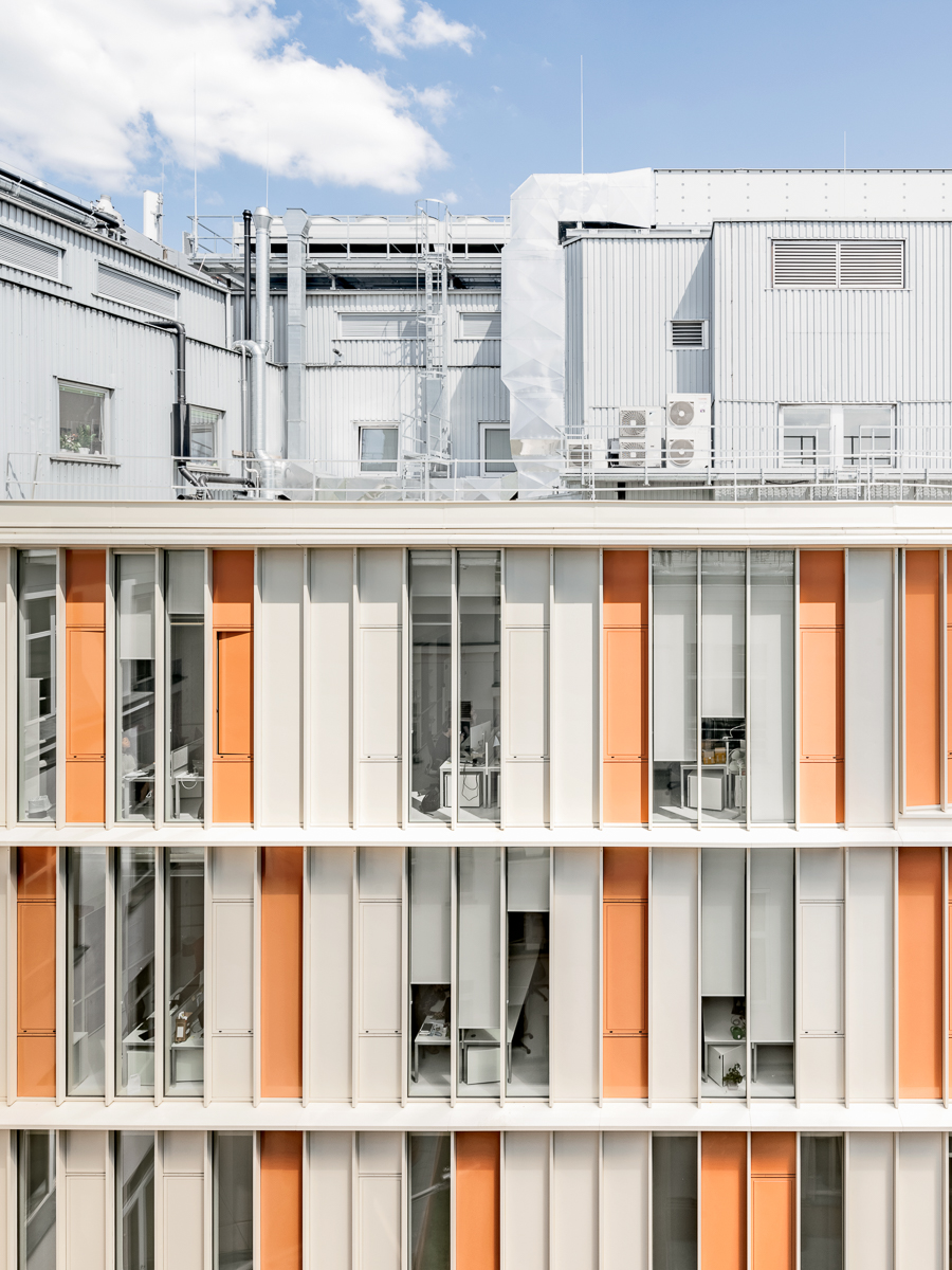 Das Außenraumkonzept sieht darüber hinaus ein Wechselspiel von Begrünung und Pflasterung im bestehenden Innenhof vor, sodass dieser deutlich an Aufenthaltsqualität gewinnt und durch eine verbesserte Zugänglichkeit die Anlieferung der Werkstätten erleichtert. Die Fassade zeigt ein rhythmisches Wechselspiel aus Glaselementen und geschlossenen, öffenbaren Paneelen in hellem Rostrot, die sich durch ihre Farbgebung harmonisch in den historischen Bestand eingliedern.