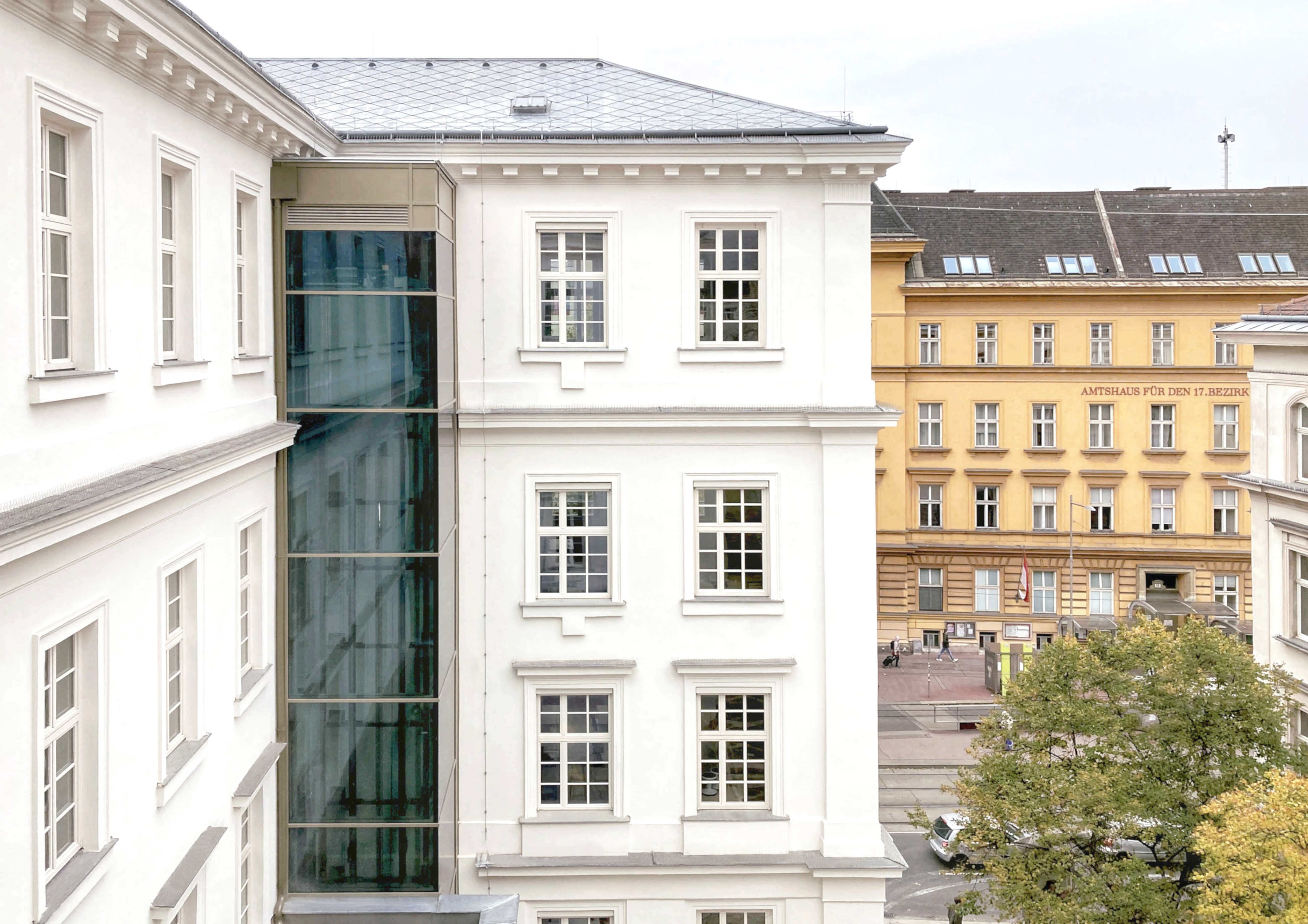 Ein zentraler Schwerpunkt ist die Verbesserung der Barrierefreiheit. Dazu gehören ein neu gestalteter, barrierefreier Eingang und Vorplatz sowie ein verglaster Aufzug an der Ostseite, der sämtliche Geschoße erschließt. Ergänzend entsteht auf der gegenüberliegenden Seite ein weiterer verglaster Zubau, der in den oberen Ebenen einen zusätzlichen Fluchtweg schafft.